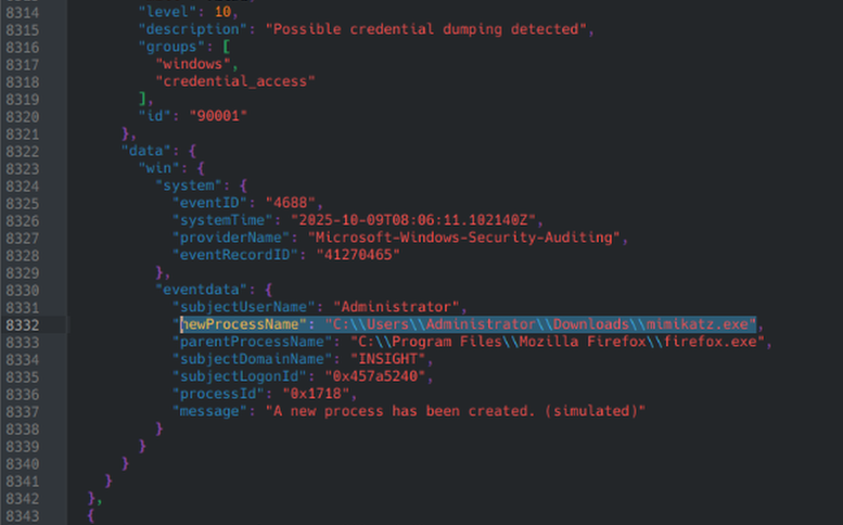 After searching to find a suspicious executable that could be a credential dump, we find a log with mimikatz.exe, as well as an alert from Wazuh saying “Possible credential dumping detected.” Mimikatz is a well known credential dumping software, and any time it is found in an incident, it is certain to have credential dumping involved.