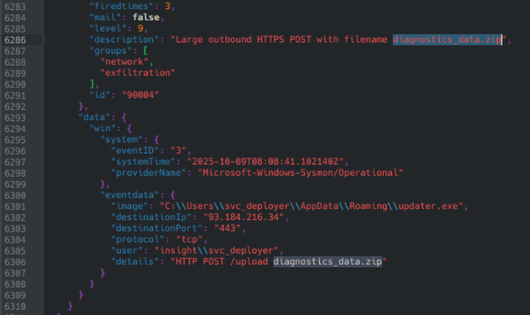 We are presented with the information about ‘Insight Nexus’ being that they are “a mid-sized market research and data analytics firm headquartered in Singapore.” As well as that this company focuses on providing competitive intelligence and consumer insights. This company had fallen victim to a brute force attack on an unsecured internet-facing application. After gaining access, the attackers performed reconnaissance, had created new Active Directory accounts, and escalated their privileges. This incident was discovered when an analyst from the SOC team had found an alert on TheHive regarding suspicious file creation.
