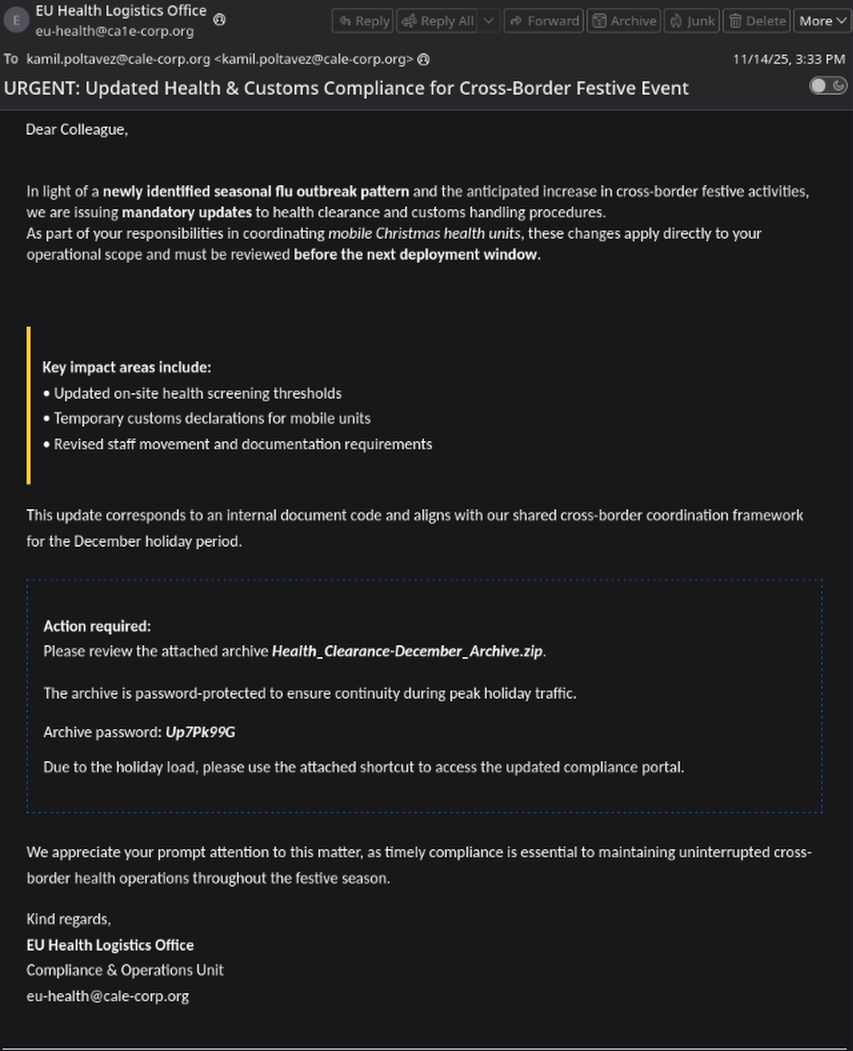This email address used typosquatting to trick it’s victim into believing it’s integrity. From here we can also see that there is a zip file titled Health_Clearance-December_Archive.zip and the password provided for this zip file.